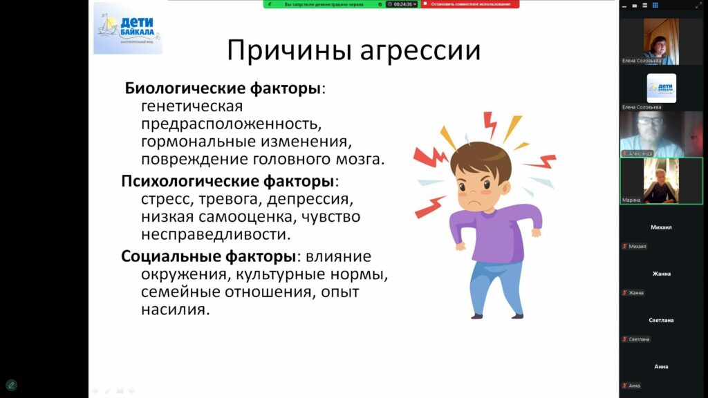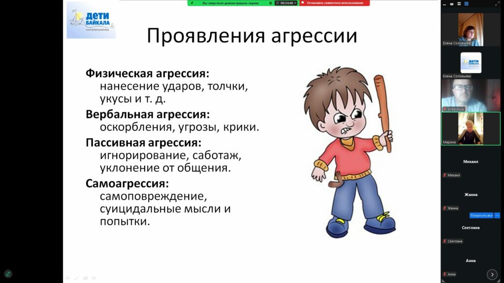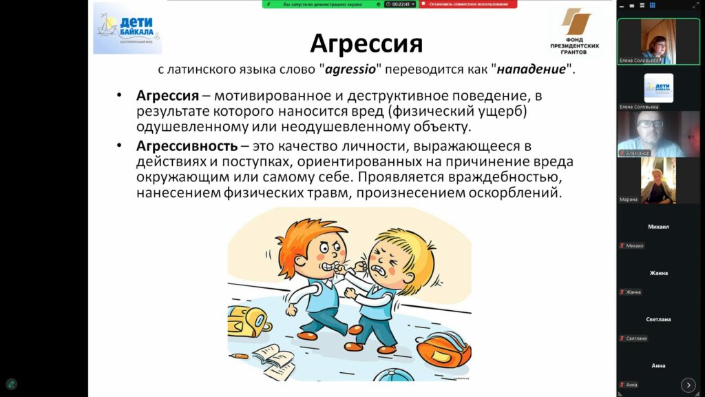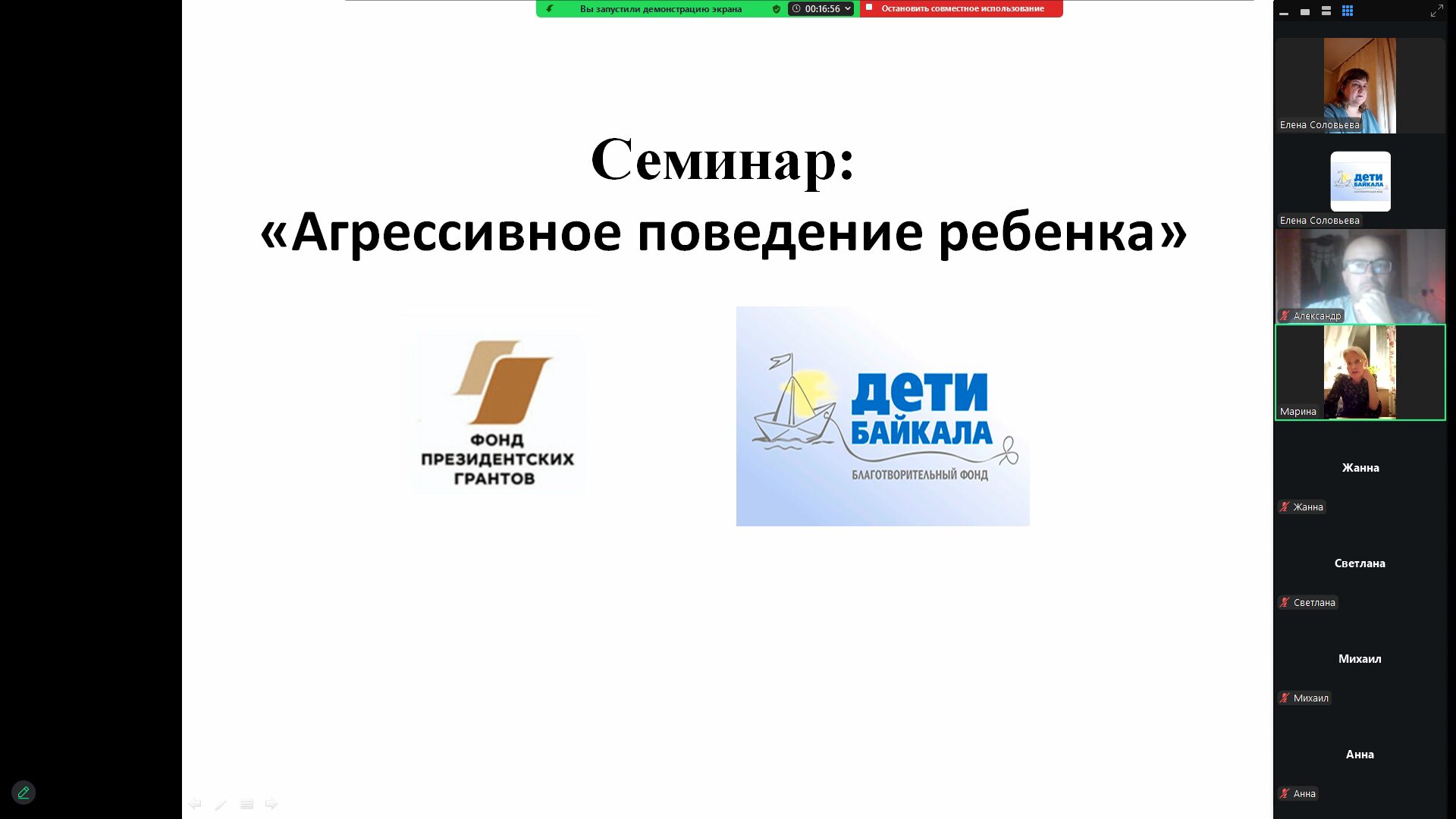 20 октября психологи Благотворительного фонда «Дети Байкала» провели семинар для приемных родителей, кандидатов в приемные родители, наставников, волонтеров и специалистов, работающих с детьми-сиротами и детьми, оставшимися без попечения родителей. Тема семинара «Агрессивное поведение ребенка».