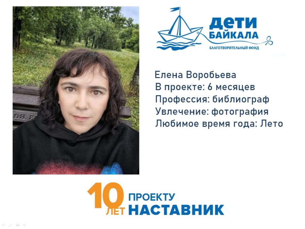 Я пришла в проект «Наставник» после непростого периода в своей жизни. Но когда я справилась, наполнила себя, свой внутренний мир, чтобы отдавать. Я прошла обучение, собрала все необходимые бумаги и с необходимым настроем пришла в проект. Мои близкие с пониманием и уважением отнеслись, что я приняла такое решение, сказали, что это очень большая ответственность. Познакомилась с Дашей я 14 апреля, я очень запомнила этот день, улыбку Даши. И ещё это был день рождения моей мамы. Мы познакомились, пообщались и приняли решение дружить. Даша из многодетной семьи, очень любит своих сестер и брата. В наши первые встречи мы с Дашей посвятили кулинарии, например, готовили домашнюю шаурму. Гуляли в парке, недалеко от центра помощи детям. Я брала с собой фотоаппарат, рассказывала Даши о фотографии. В первые встречи Даша меня не называла никак, просто «вы». Но потом после экскурсии в областную библиотеку имени И.И. Молчанова-Сибирского, она стала называть меня Леной. Трудностей, как и ссор не возникало. Гуляли по Набережной, катались на колесе обозрения. Даша каталась впервые. Я заметила, что Даша внимательная. Расстрогал момент в лагере. Даша раскрасила стаканчик бумажный и написала на нем «Лена я тебя люблю». Пока не могу сказать, что в нас конкретно изменилось. Но одно могу сказать, что наставничество меняет. Считаю наставничество очень важной и эффективной помощью для ребенка. Хотелось бы пожелать младшему другу быть открытым, честным и доверять наставнику. Наставнику, который готовиться им стать пожелаю стать настоящим другом ребенку, уметь слышать и слушать младшего друга.