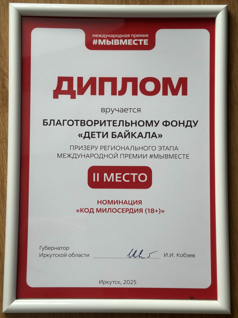 Благотворительный фонд «Дети Байкала» стал призером регионального этапа Международной Премии #МЫВМЕСТЕ с проектом «Подари ребенку семью» и занял второе место в номинации «Код милосердия».