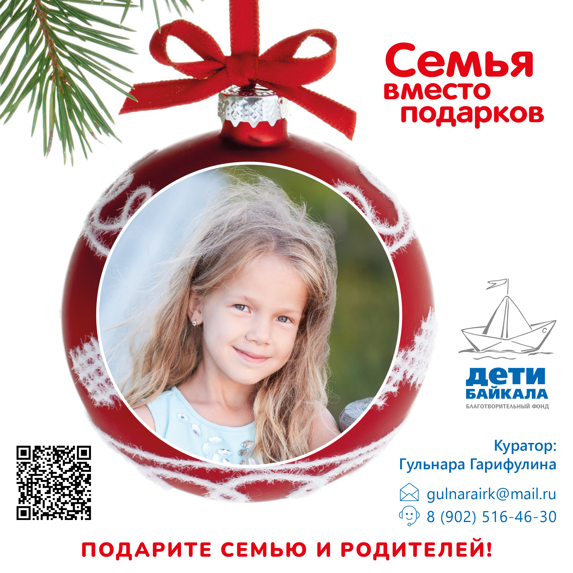 Благотворительный фонд «Дети Байкала» традиционно запускает акцию «Семья вместо подарков». Очень скоро наступит Новый год и многие захотят сделать сиротам подарки. О чем мечтают дети, живущие в детских домах? Конечно, о родителях и настоящей семье. Поэтому мы и запускаем эту волшебную акцию. Наш фонд на протяжении нескольких лет успешно реализует проект «Подари ребенку семью». Благодаря проекту у ребёнка-сироты появляется видеоанкета, где он рассказывает о себе и реальный шанс найти ему родителей. Более 600 детей-сирот из Иркутской области, у которых были наши видеоанкеты, уже нашли родителей! Мы обращаемся за помощью ко всем неравнодушным людям!