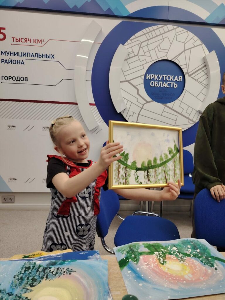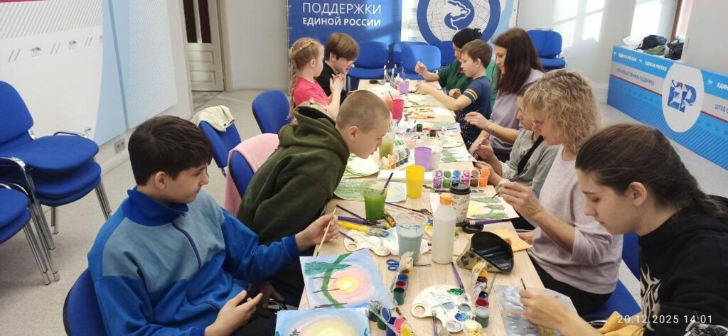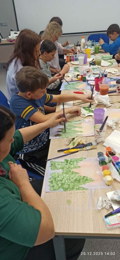 Взрослые и дети смешивали краски, придумывали свои заснеженные деревья, рисовали красивейшее небо, искрящийся снег на ветках елей. Яркие, сочные краски оживали на бумаге, превращаясь в неповторимые зимние пейзажи.