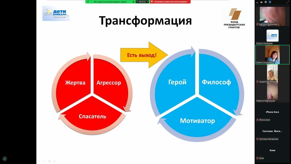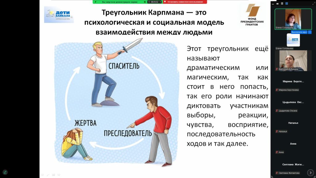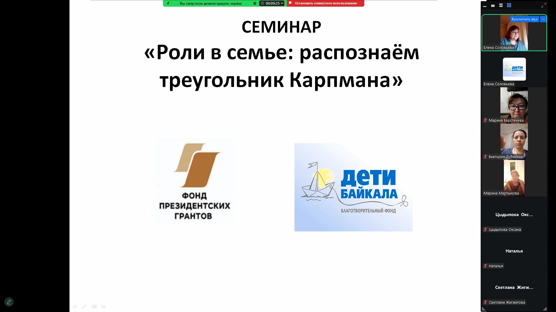 5 февраля психологи Благотворительного фонда «Дети Байкала» провели семинар для приемных родителей, кандидатов в приемные родители, наставников, волонтеров и специалистов, работающих с детьми-сиротами и детьми, оставшимися без попечения родителей. Тема семинара «Роли в семье: распознаём треугольник Карпмана»