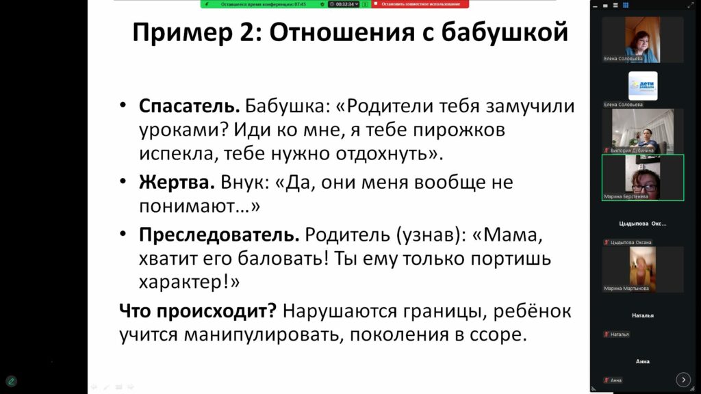 Треугольник Карпмана (также известен как «драматический треугольник») — модель отношений, разработанная американским психотерапевтом Стивеном Карпманом в 1968 году, которая описывает сценарий взаимодействия между людьми, основанный на трех конкретных ролях. На семинаре мы разбирались, как в семьях, даже самых любящих, мы иногда попадаем в ловушку трёх ролей: