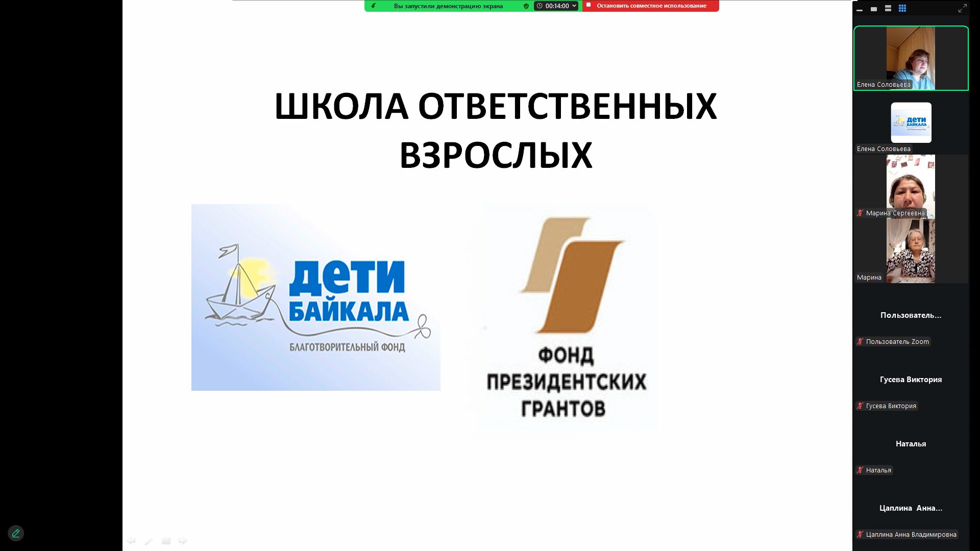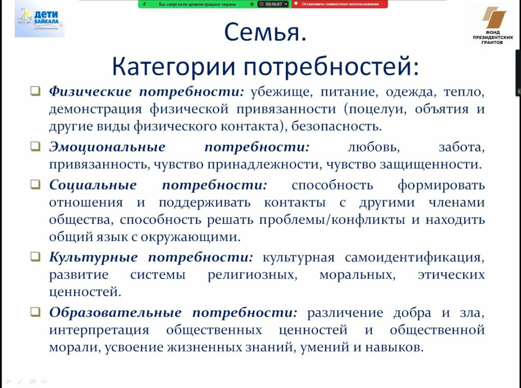Курс семинаров для приемных родителей, кандидатов в приемные родители, наставников, волонтеров и специалистов, работающих с детьми-сиротами и детьми, оставшимися без попечения родителей проводится Благотворительным фондом «Дети Байкала» в рамках проекта «Подари ребенку семью», при поддержке Фонда Президентских грантов на развитие гражданского общества.
