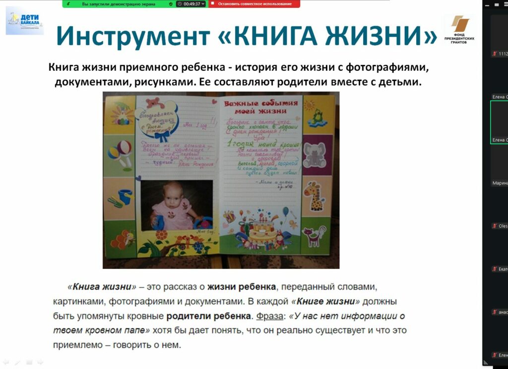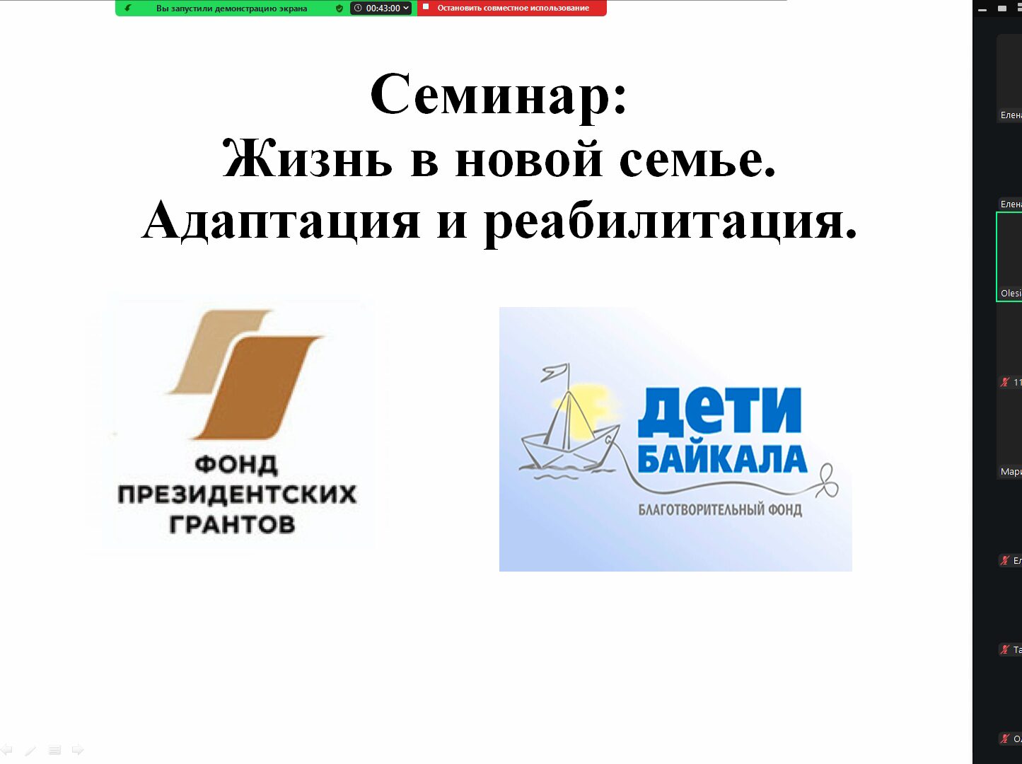 Курс семинаров для приемных родителей, кандидатов в приемные родители, наставников, волонтеров и специалистов, работающих с детьми-сиротами и детьми, оставшимися без попечения родителей, проводится Благотворительным фондом «Дети Байкала» в рамках проекта «Подари ребенку семью», при поддержке Фонда Президентских грантов на развитие гражданского общества.