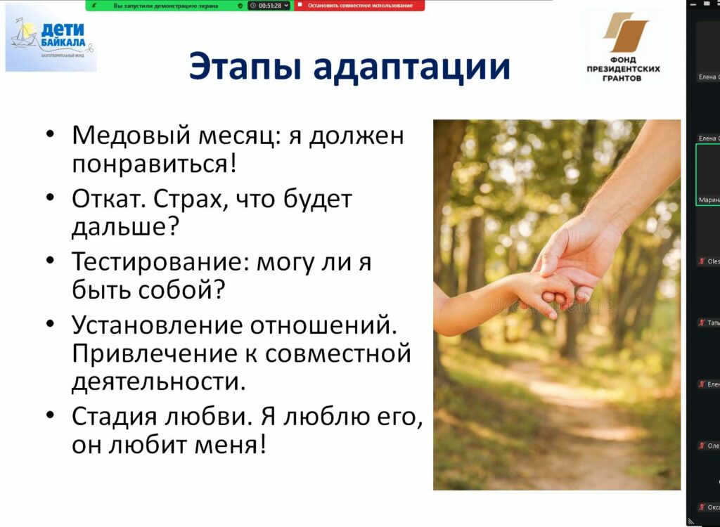 Заключительный семинар был посвящен адаптации и реабилитации детей, которые прошли не легкий путь, прежде чем оказались в новой семье. Новая жизнь начинается не только для ребенка, но и для семьи. Очень важно родителям научиться: безусловно принимать ребенка; принимать эмоции ребенка, учитывая его психологический возраст, сверять свои требования с возможностями ребенка, удерживать свои и соблюдать границы ребенка; быть всегда предсказуемым и безоценочным.