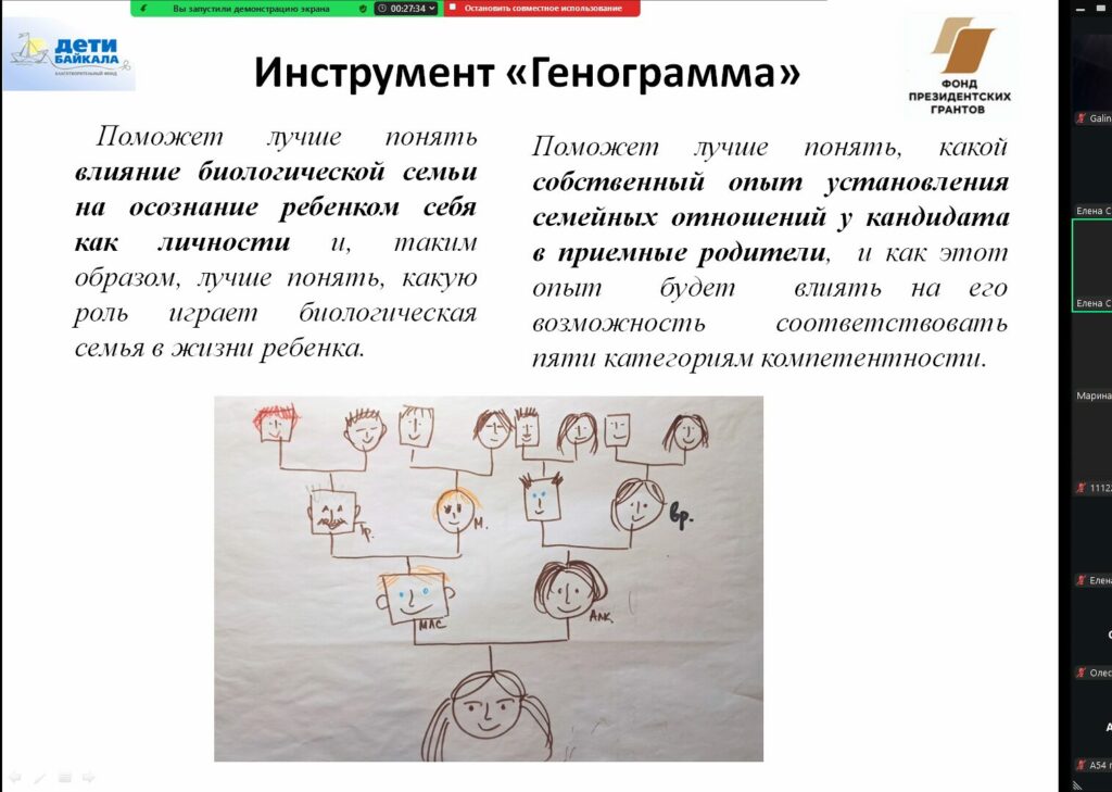 На последних четырех встречах, 24, 26, 31 марта и 2 апреля, мы говорили о постоянстве в жизни ребенка и как родители могут создавать постоянство для ребенка. Рассмотрели инструмент «Книга жизни», с помощью которого можно говорить о прошлом ребенка и помогать строить будущее. Разбирали вопрос о том, как помочь сформировать положительную самооценку ребенку. Стоили генограмму для себя и для ребенка, с помощью которой можно увидеть семейную историю, но и найти ресурсы, как для приемных родителей, так и для ребенка.