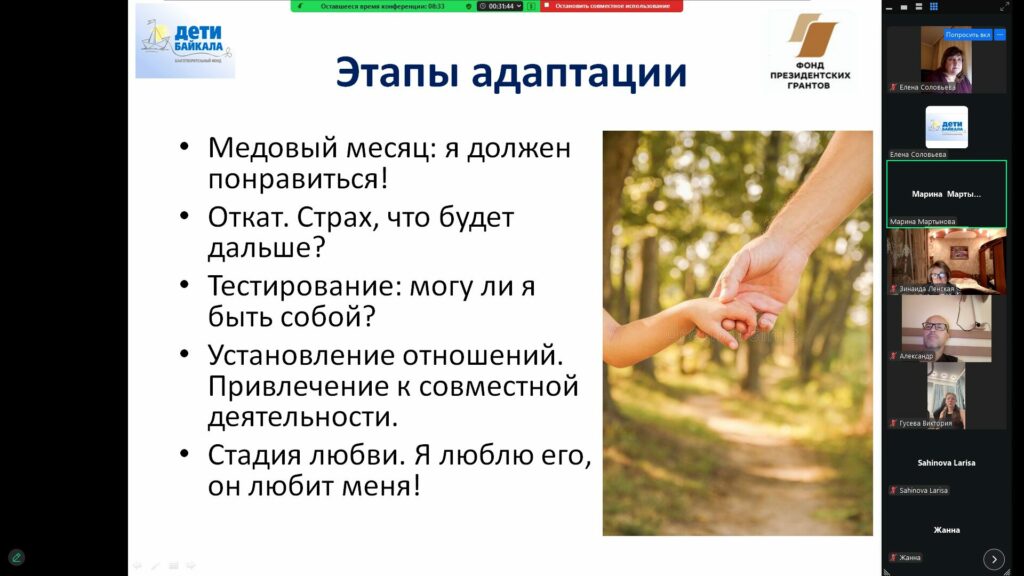 На заключительном семинаре мы говорили об адаптации. Адаптация ребёнка в приёмной семье — это сложный процесс, который может занять длительное время. Он включает в себя множество аспектов, таких как установление доверия, формирование привязанности, преодоление психологических и эмоциональных проблем. Новая жизнь начинается не только для ребенка, но и для семьи. Очень важно родителям научиться: безусловно принимать ребенка, принимать эмоции ребенка, учитывая его психологический возраст, сверять свои требования с возможностями ребенка, удерживать свои и соблюдать границы ребенка; быть всегда предсказуемым и безоценочным.